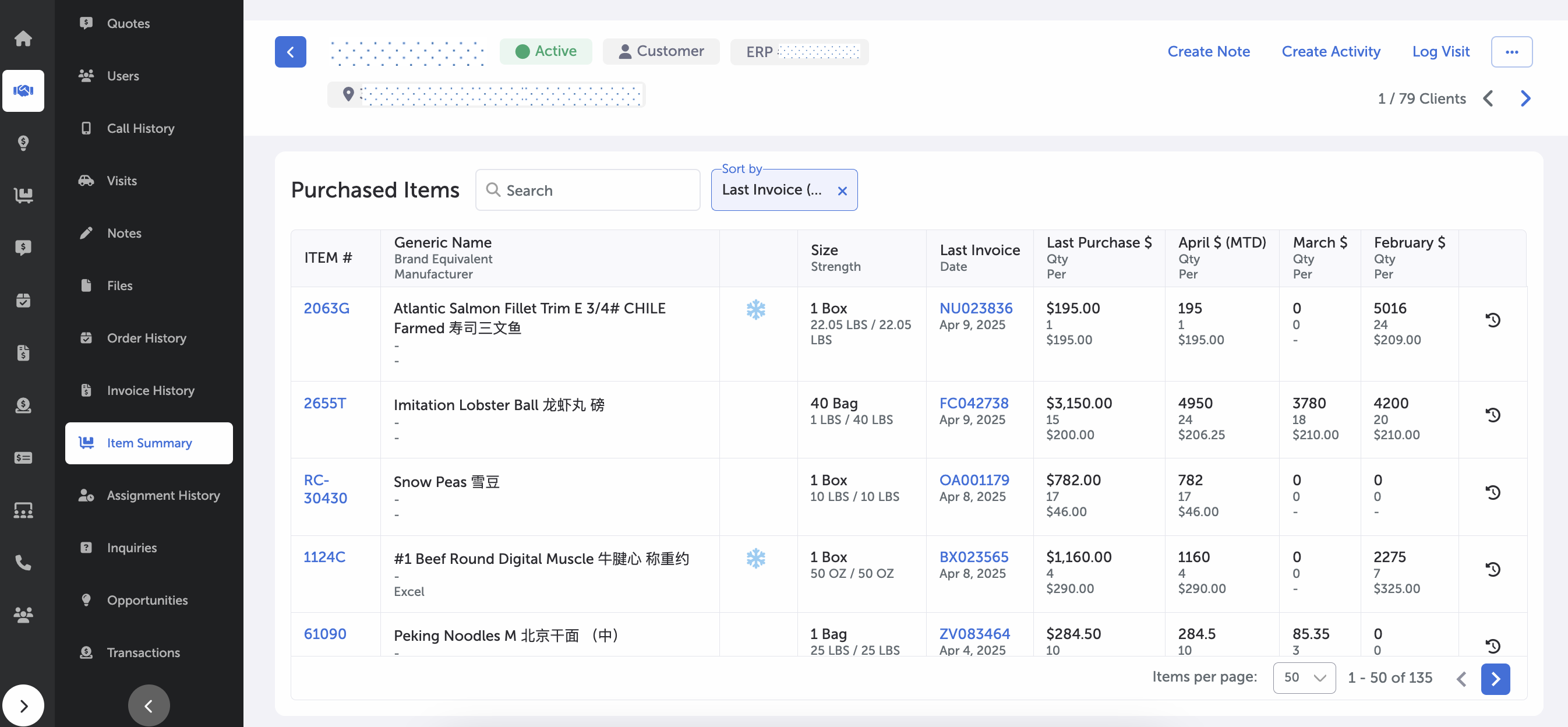 The Item Summary page within the client navigation area allows you to scan, view, and explore the individual items purchased by that particular client. This page is for customers only (not leads).